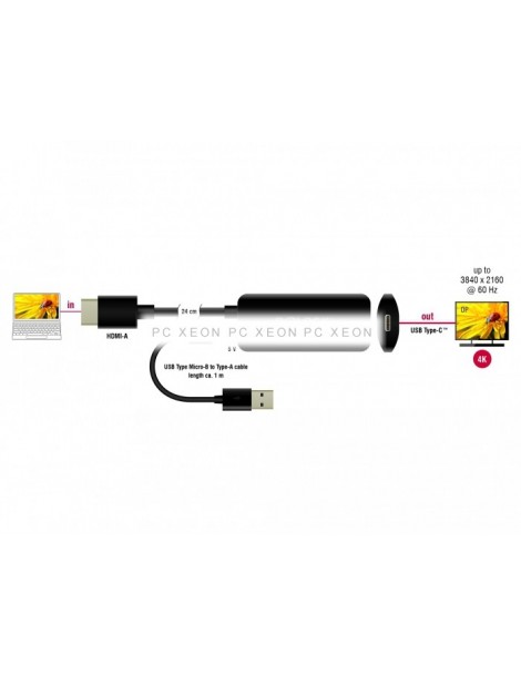 This adapter Delock allows the connection of a USB Type-CTM monitor (DisplayPort Alternate Mode) to a free HDMI interface of a PC or laptop. The adapter will connect to the HDMI connector of the PC or laptop and will connect with an existing USB-CTM cable.