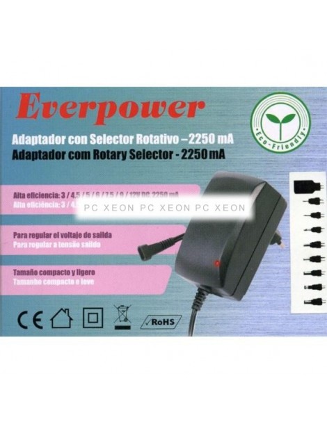 Universal transformer of 2250mAh. Supports 3V, 4.5V, 5V, 6V, 7.5V, 9V and 12V. Includes 8 different types of connector.