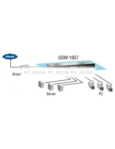 GSW-1657 è un interruttore Ethernet Gigabit a 16 port che offre alte prestazioni, basso costo, facilità d'uso e aggiornamento per amplificare la rete a 1000 Mbps. Aumentare la velocità della colonna vertebrale di rete a un incredibile 32 Gbps e fornire velocità di gigabit a tutti i computer.