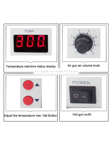 La maniglia è dotata di un interruttore automatico, quando viene afferrato con la mano inizia e quando viene rilasciata solo la fermata. Il sistema è inoltre dotato di funzionalità aria automatica a freddo, se raffreddata, entrerà automaticamente nello stato di risparmio energetico, può prolungare la durata del riscaldatore e con esso protegge la pistola ad aria calda.