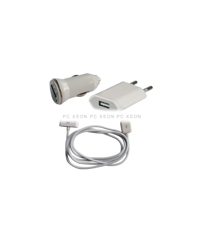 Carregador 3 em 1 que inclui cabo USB e carga, carregador de carro e carregador de casa.