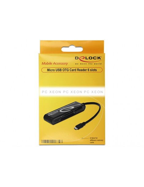 O leitor de cartão Delock Ele permite executar operações de leitura e gravação em cartões de memória através da porta Micro USB OTG do tablet ou smartphone.